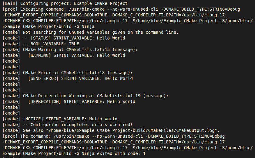 - CMake 출력에서 보통의 정보와 함께 표시된다.