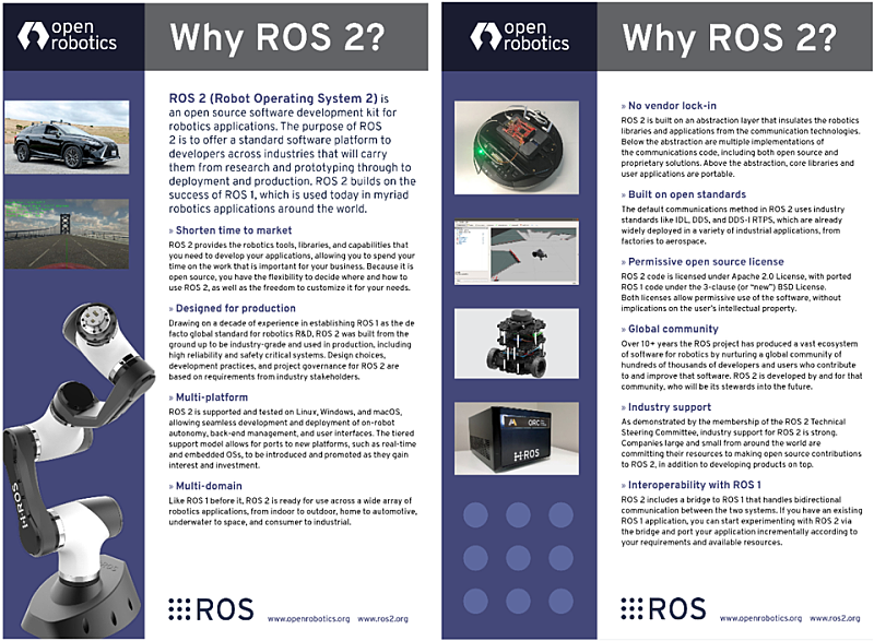 ROS2는 로보틱스 R&D의 사실 상의 글로벌 표준으로 ROS1의 10년 경험을 바탕으로 ROS2는 처음부터 산업용 수준으로 개발되고 높은 신뢰성과 안전을 중시하고 있다. ROS2의 설계, 개발 및 프로젝트 관리는 업계 이해관계자들로 부터 얻은 실질적인 요구 사항을 기반으로 한다.