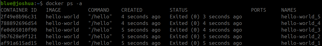 for ii in {5..10}; do docker run --name hello-world_${ii} hello-world; done