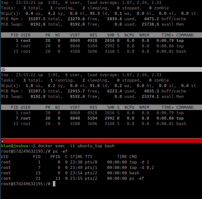docker run -it --name ubuntu_top ubuntu "top" "-d 1"