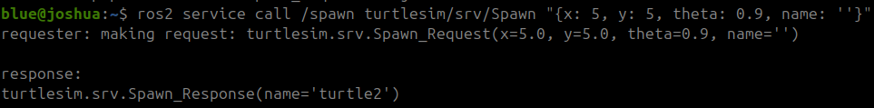 ros2 service call /spawn turtlesim/srv/Spawn "{x: 5, y: 5, theta: 0.9, name: ''}"이번에는 spawn을 해보자.