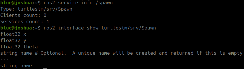 위의 명령어는 /spawn에 turtlesim/srv/Spawn type의 msg를 service call 하겠다는 의미이다.