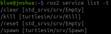 ros2 service type Topic과 마찬가지로 명령어의 뒤에 '-t'를 붙여서 type을 확인 할 수도 있다.