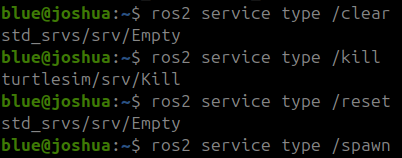 ros2 service type <service_name>위의 ros2 service list에서 살펴본 몇 가지 service에 대해 type을 살펴보면, 다음과 같다.