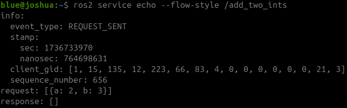 ros2 service echo --flow-style /add_two_intsros2 service echo
