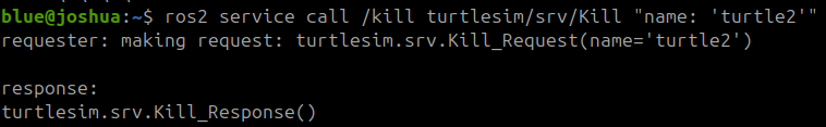 ros2 service call /kill turtlesim/srv/Kill "name: 'turtle2'"이번에는 kill 명령어를 사용하여 생성한 turtle을 지워보자.