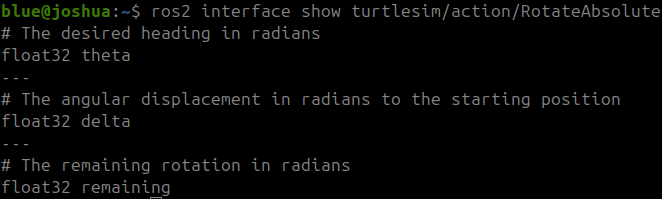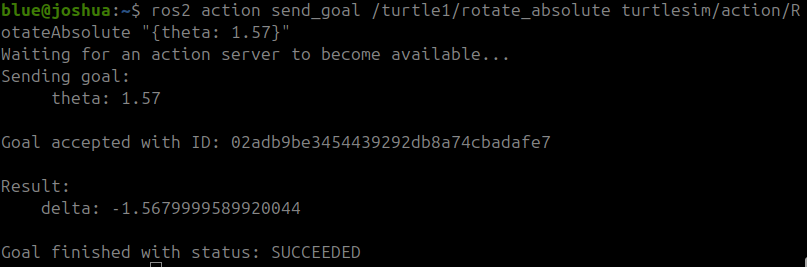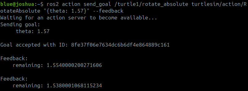 ros2 action send_goal /turtle1/rotate_absolute turtlesim/action/RotateAbsolute "{theta: 1.57}"