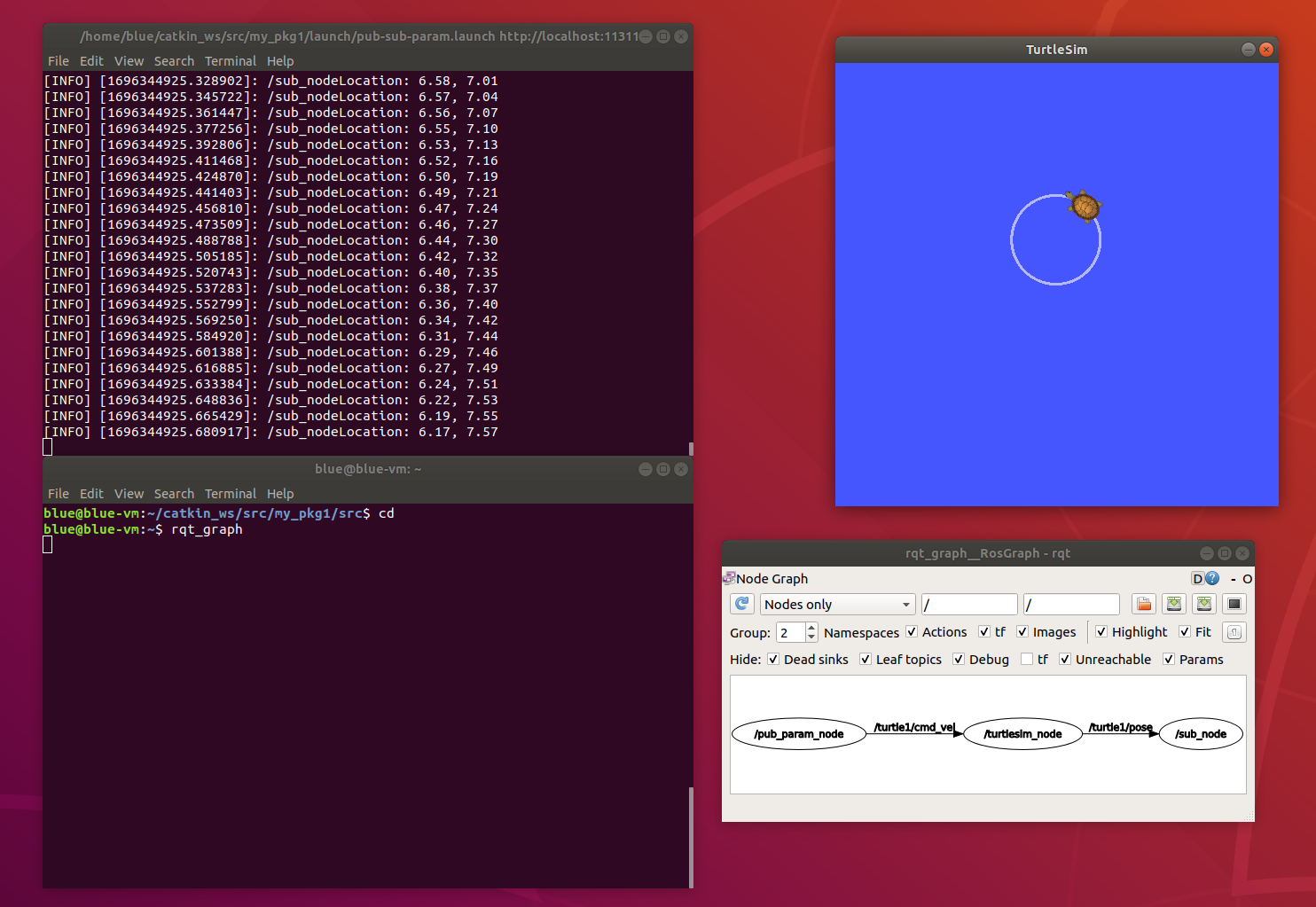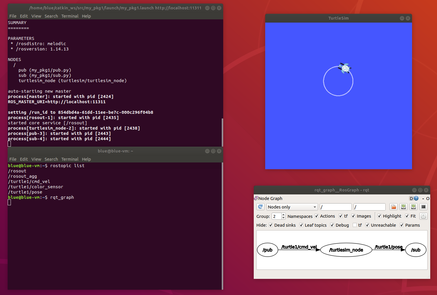 # my_pkg1.launch <launch> <node pkg="turtlesim" type="turtlesim_node" name="turtlesim_node"/> <node pkg="my_pkg1" type="pub.py" name="pub"/> <node pkg="my_pkg1" type="sub.py" name="sub"/> </launch>실행