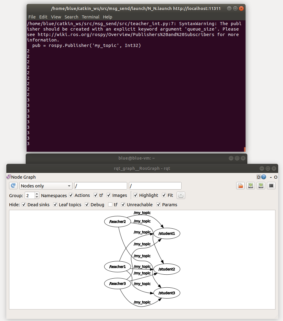 <launch> <node pkg="msg_send" type="teacher_int.py" name="teacher1"/> <node pkg="msg_send" type="teacher_int.py" name="teacher2"/> <node pkg="msg_send" type="teacher_int.py" name="teacher3"/> <node pkg="msg_send" type="student_int.py" name="student1" output="screen"/> </launch>결과: