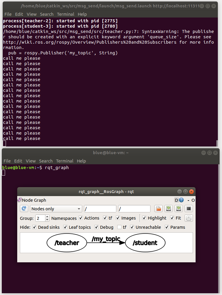 <launch> <node pkg="msg_send" type="teacher.py" name="teacher"/> <node pkg="msg_send" type="student.py" name="student" output="screen"/> </launch>이제 명령어를 입력하여 msg_send.launch를 실행해보자.