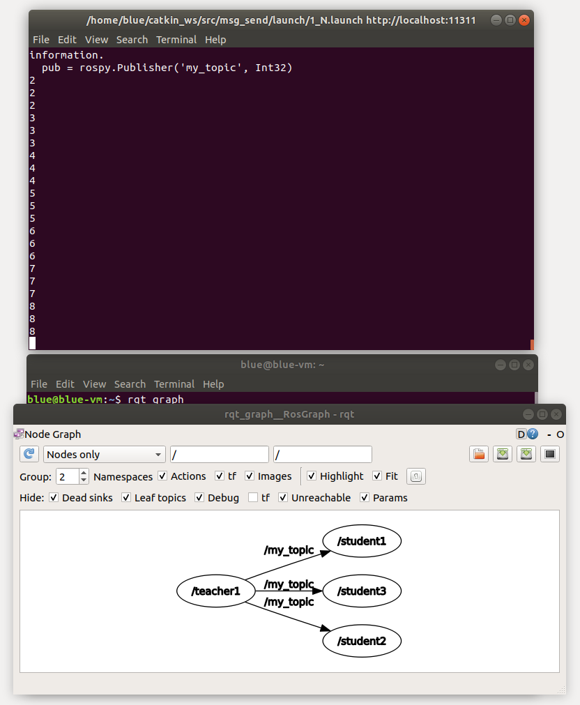 <launch> <node pkg="msg_send" type="teacher_int.py" name="teacher1"/> <node pkg="msg_send" type="student_int.py" name="student1" output="screen"/> <node pkg="msg_send" type="student_int.py" name="student2" output="screen"/> <node pkg="msg_send" type="student_int.py" name="student3" output="screen"/> </launch>결과: