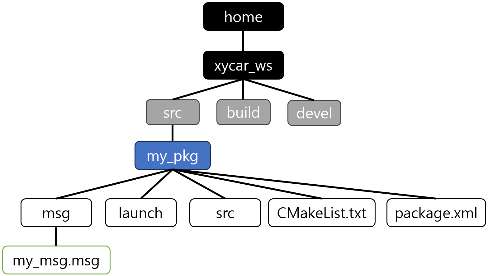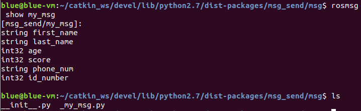 $ rosmsg show my_msg # 나의 msg확인 $ ~/catkin_ws/devel/lib/python2.7/dist_packages/msg_send/msg # 해당 디렉토리에 생성된 msg확인이 가능하다.