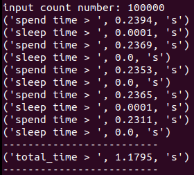 #!/usr/bin/env python import rospy import time from std_msgs.msg import Int32 def do_job(count): for i in range(0, count): i = i + 1 pub.publish(i) def list_append_time(): start.append(start_time) end.append(end_time) sleep.append(sleep_time) name = "sender_job" pub_topic = "my_topic" rospy.init_node(name) pub = rospy.Publisher(pub_topic, Int32, queue_size=0) rate = rospy.Rate(5) while not rospy.is_shutdown(): start = [] end = [] sleep = [] num = input("input count number: ") rate.sleep() total_start = time.time() for j in range(0, 5): start_time = time.time() do_job(num) end_time = time.time() rate.sleep() sleep_time = time.time() list_append_time() total_end = time.time() for t in range(0, 5): sleep[t] = sleep[t] - end[t] end[t] = end[t] - start[t] for result in range(0, 5): print("speed time > ", round(end[result], 4), 's') print("sleep time > ", round(sleep[result], 4), 's') print("-------------------------") print("total_time > ", round(total_end - total_start, 4), 's') print("-------------------------\n\n")