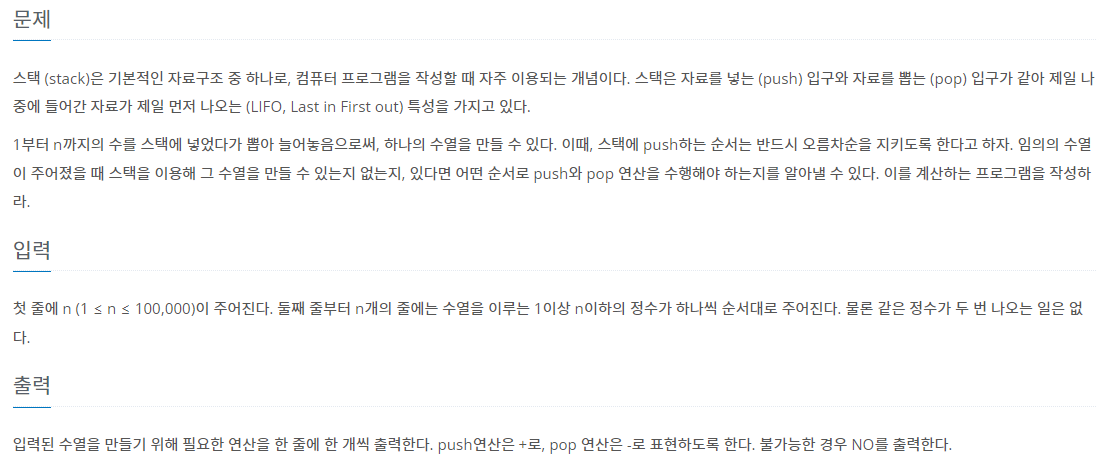 #include <iostream> #include <vector> using namespace std; int main() { ios::sync_with_stdio; cin.tie(0); vector<int> i_stack; vector<char> o_stack; int repeat_num; int count = 1; int my_num; int check_output = 1; cin >> repeat_num; for (int i = 0; i < repeat_num; i++) { cin >> my_num; while (count <= my_num) { i_stack.push_back(count); o_stack.push_back('+'); count++; } if (i_stack[i_stack.size()-1] == my_num) { i_stack.pop_back(); o_stack.push_back('-'); } else { cout << "NO"; check_output = 0; break; } } if (check_output == 1) { for (auto ele : o_stack) { cout << ele << endl; } } }'Algorithm > _Baekjoon' 카테고리의 다른 글