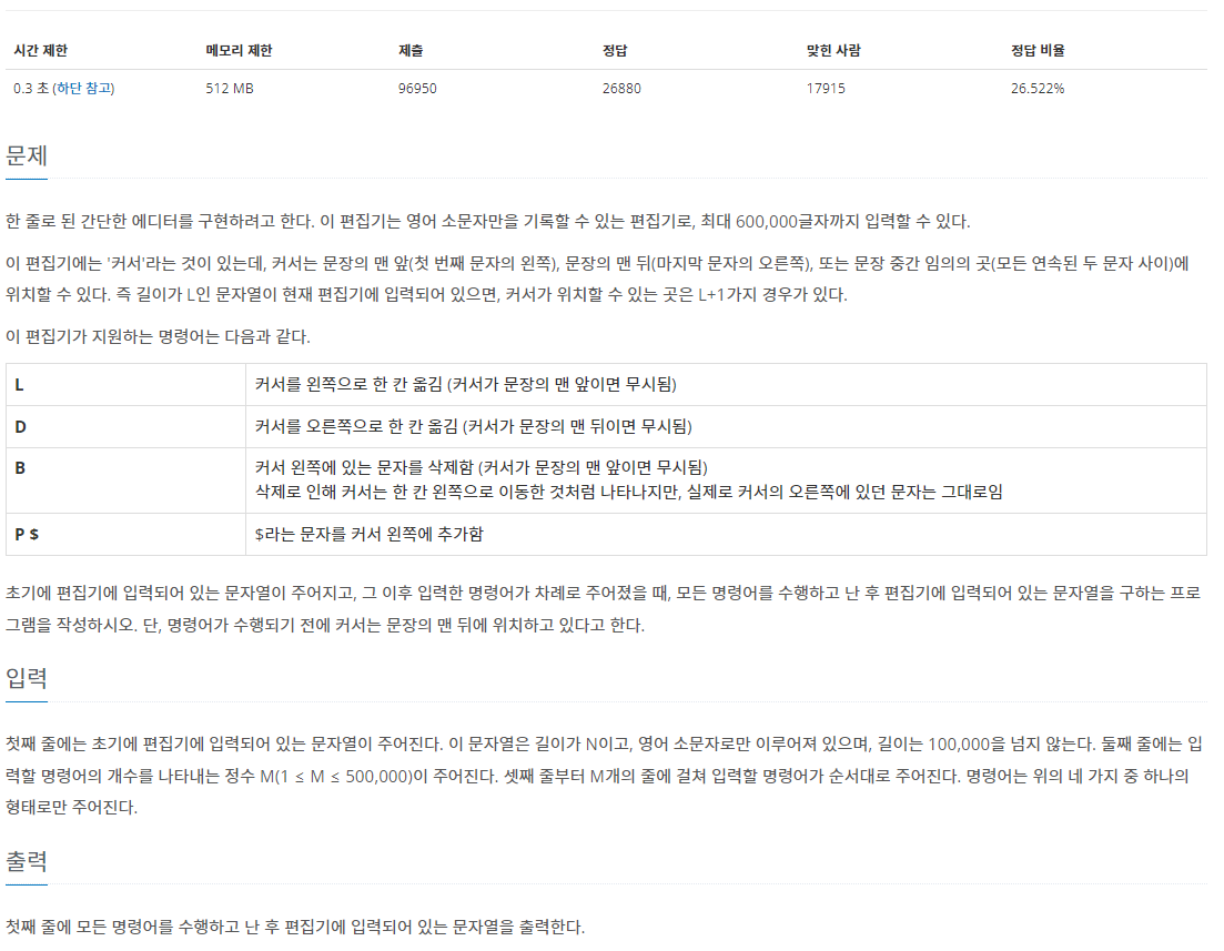import sys def main(): my_string_list: list = list(sys.stdin.readline().rstrip()) # strip은 공백을 제거해주는 함수이다. repeat_num: int = int(sys.stdin.readline()) # 데이터 전처리 cur_locate = len(my_string_list) # 현재 커서의 위치 for i in range(repeat_num): order: str = sys.stdin.readline() list_order: list = list(order) if (list_order[0] == 'L' and cur_locate != 0): cur_locate -= 1 elif (list_order[0] == 'D' and cur_locate != len(my_string_list)): cur_locate += 1 elif (list_order[0] == 'B' and cur_locate != 0): my_string_list.pop(cur_locate) cur_locate -= 1 elif (list_order[0] == 'P'): my_string_list.insert(cur_locate, list_order[2]) # 시간제한에 걸리는 부분으로 예상 cur_locate += 1 print(''.join(my_string_list)) if __name__=="__main__": main()많이 생각을 해봤지만 떠오르지 않아서 다른 사람들의 풀이를 보니 두개의 list를 사용해서 문제를 풀었습니다.