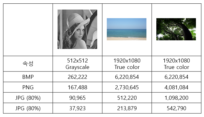 BMP, PNG, JPG의 각 파일에 대해 용량을 비교하면 다음과 같다.