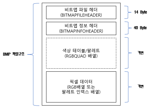 typedef struct tagBITMAPFILEHEADER{ WORD bfType; // 'B', 'M', 0x42, 0x4D DWORD bfSize; // BMP 파일 크기 WORD bfReserved1; WORD bfReserved2; DWORD bfOffBits; // 비트맵 비트까지의 오프셋 } BITMAPFILEHEADER;비트맵 정보 헤더