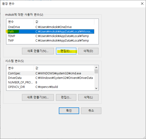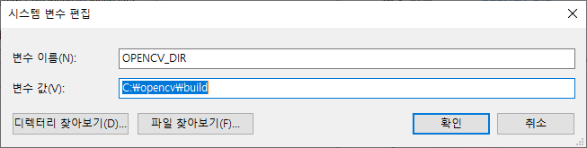 - 변수 이름: OPENCV_DIR, 변수 값: C:\opencv\build