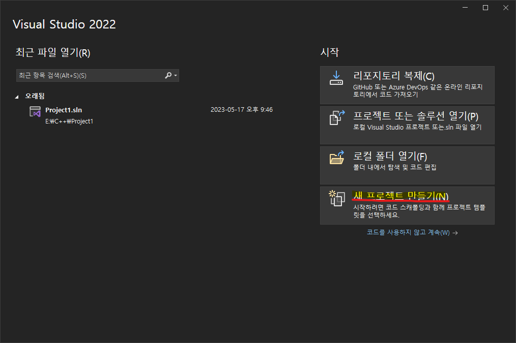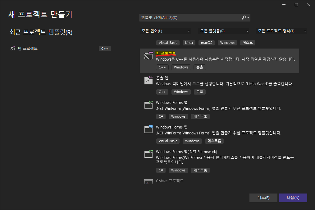 1. Visual studio 2022를 실행. [새프로젝트] → [빈 프로젝트] → [프로젝트 이름] 설정