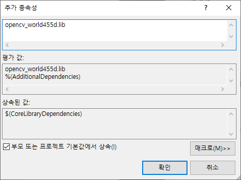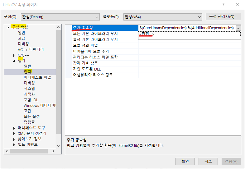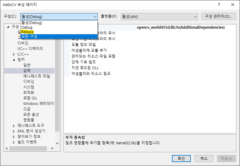 - 추가 종속성 항목에 opencv_world455d.lib 추가 (Release 모드는 opencv_world455.lib 추가)