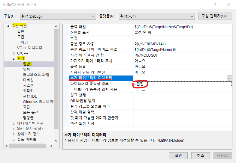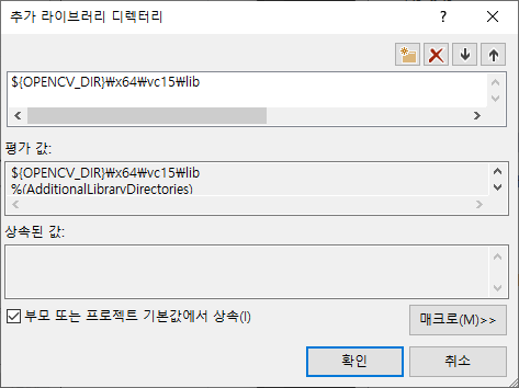 - 추가 라이브러리 디렉터리 항목에 "$(OPENCV_DIR)\x64\vc15\lib" 입력