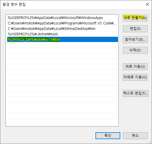 2. 새로 만들기를 누르고 다음 경로 입력: "%OPENCV_DIR%\x64\vc15\bin"