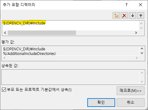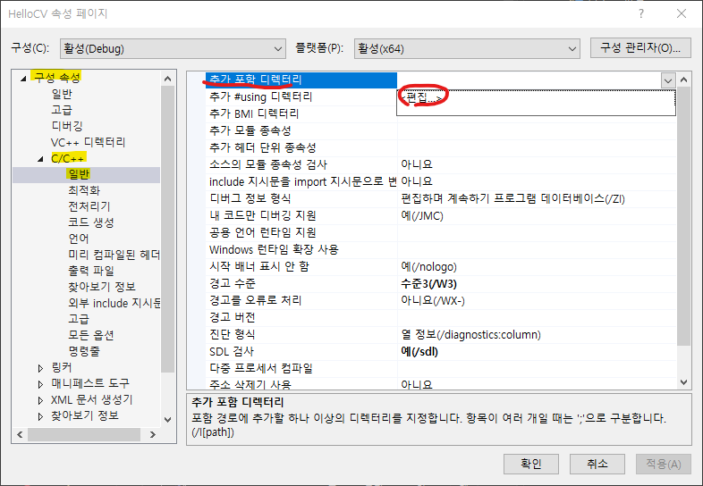 - 추가 포함 디렉터리 항목에 "$(OPENCV_DIR)\include" 입력