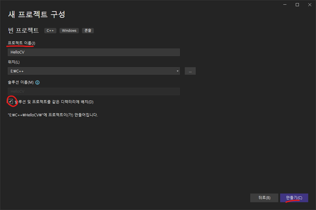 ( 솔루션 및 프로젝트를 같은 디렉토리에 배치 선택) 2. (활성) 솔루션 플랫폼이 x64로 설정이 되어 있는지 확인 이후 소스 파일 폴더에 main.cpp파일 추가.