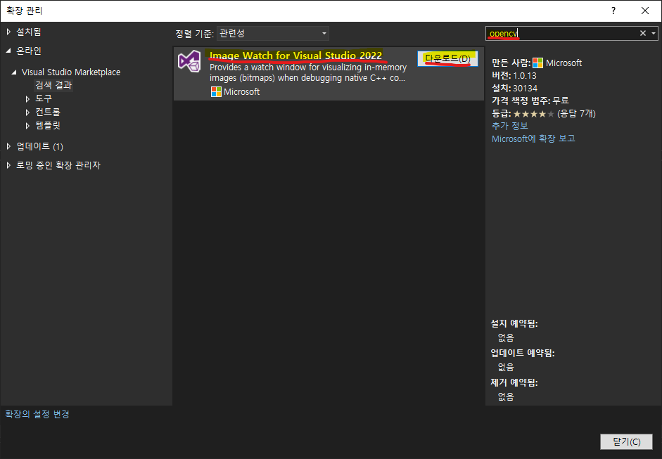 - Image Watch for Visual Studio 2022 항목에서 [다운로드] 클릭한다.