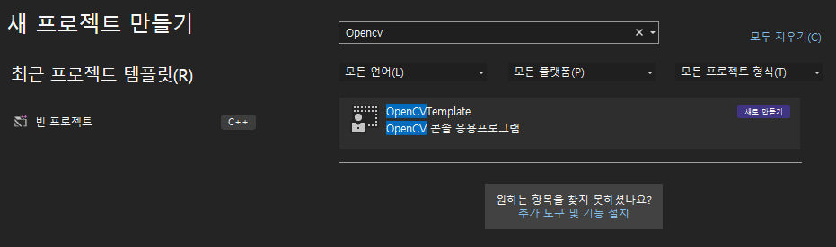 이번에는 OpenCV 개발을 위한 추가 포함 디렉토리 및 추가 라이브러리, 추가 종속성 등이 미리 설정된 콘솔 응용 프로그램 프로젝트를 생성하고자 한다.