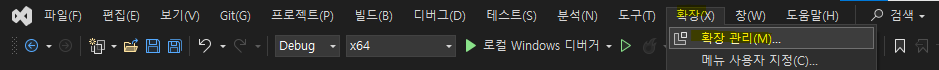 - Visual Studio 2022 메뉴에서 [확장] → [확장 관리]를 선택한다.