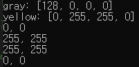 cv::Scalar gray = 128; std::cout << "gray: " << gray << std::endl; cv::Scalar yellow(0, 255, 255); std::cout << "yellow: " << yellow << std::endl; for (int i = 0; i < 4; i++) { std::cout << yellow.val[i] << ", " << yellow[i] << std::endl; }결과