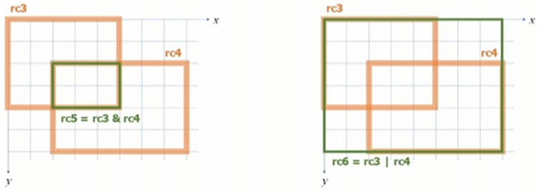 cv::Rect rc1; // [0 by 0 from (0, 0)] cv::Rect rc2(10, 10, 60, 40); // [60 by 40 from (10, 10)] cv::Rect rc3 = rc1 + cv::Size(50, 40); // [50 by 40 from (0, 0)] cv::Rect rc4 = rc2 + cv::Point(10, 10); // [60 by 40 from (20, 20)] cv::Rect rc5 = rc3 & rc4; // AND연산 [30 by 20 from (20, 20)] cv::Rect rc6 = rc3 | rc4; // OR연산 [80 by 60 from(0, 0)]