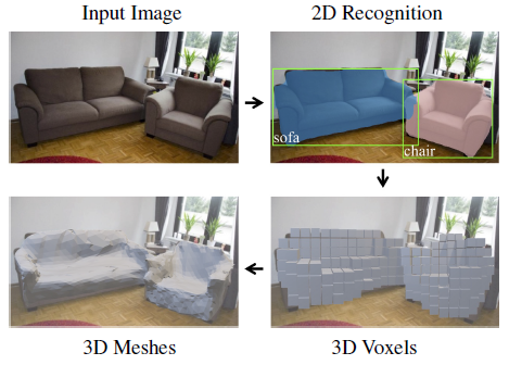 G, Gkioxari, J.Malik, J.Johnson, "Mesh R-CNN" 2D상의 객체를 인식하는 방법은 어느정도 정복하였지만, 3D 세상을 2D 이미지 및 영상에서 이해하기는 쉽지 않다.