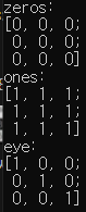 zeros는 0행렬, ones는 1행렬, eye는 단위 행렬(identity matrix)을 만들어준다.