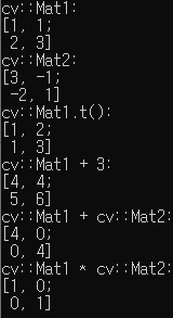 void MatOp5() { float data[] = { 1, 1, 2, 3 }; cv::Mat Mat1(2, 2, CV_32FC1, data); std::cout << "cv::Mat1:\n" << Mat1 << std::endl; cv::Mat Mat2 = Mat1.inv(); // inverse 연산 std::cout << "cv::Mat2:\n" << Mat2 << std::endl; std::cout << "cv::Mat1.t():\n" << Mat1.t() << std::endl; // transpose 연산 std::cout << "cv::Mat1 + 3:\n" << Mat1 + 3 << std::endl; std::cout << "cv::Mat1 + cv::Mat2:\n" << Mat1 + Mat2 << std::endl; std::cout << "cv::Mat1 * cv::Mat2:\n" << Mat1 * Mat2 << std::endl; }결과