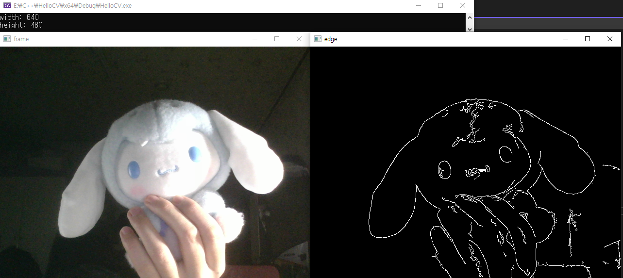 #include <iostream> #include "opencv2/opencv.hpp" int main() { cv::VideoCapture cap; cap.open(0); // 혹은 아래와 같이 사용 가능 // cv::VideoCapture cap(0); // 동영상 처리시 아래와 같이 사용 // cv::VideoCapture cap; // cap.open("동영상 경로"); // 카메라를 열지 못한 경우 아래의 오류를 출력하고 프로그램 종료. if (!cap.isOpened()) { std::cerr << "Camera open failed!" << std::endl; return -1; } int w = cvRound(cap.get(cv::CAP_PROP_FRAME_WIDTH)); // 영상의 Width 출력 int h = cvRound(cap.get(cv::CAP_PROP_FRAME_HEIGHT)); // 영상의 Height 출력 std::cout << "width: " << w << std::endl; std::cout << "height: " << h << std::endl; cv::Mat frame, edge; while (true) { cap >> frame; // VideoCapture 객체로부터 한 프레임을 받아 frame 변수에 저장. // 영상을 제대로 받지 않으면 Empty frame을 출력하고 while문 탈출 if (frame.empty()) { std::cerr << "Empty frame!" << std::endl; break; } Canny(frame, edge, 50, 150); // 50 ~ 150의 threshold를 갖는 Canny 이미지를 edge에 담음. imshow("frame", frame); imshow("edge", edge); // waitKey(1)은 1ms동안 wait if (cv::waitKey(1) == 27) // ESC를 누르면 while문 탈출 break; } cap.release(); cv::destroyAllWindows(); return 0; }결과